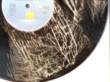 Die abgebildete Schallplatte lag mehrere Tage im Wasser. Die Konsequenz war eine hartnäckige Kalkschicht die tief in die Rillen reichte.